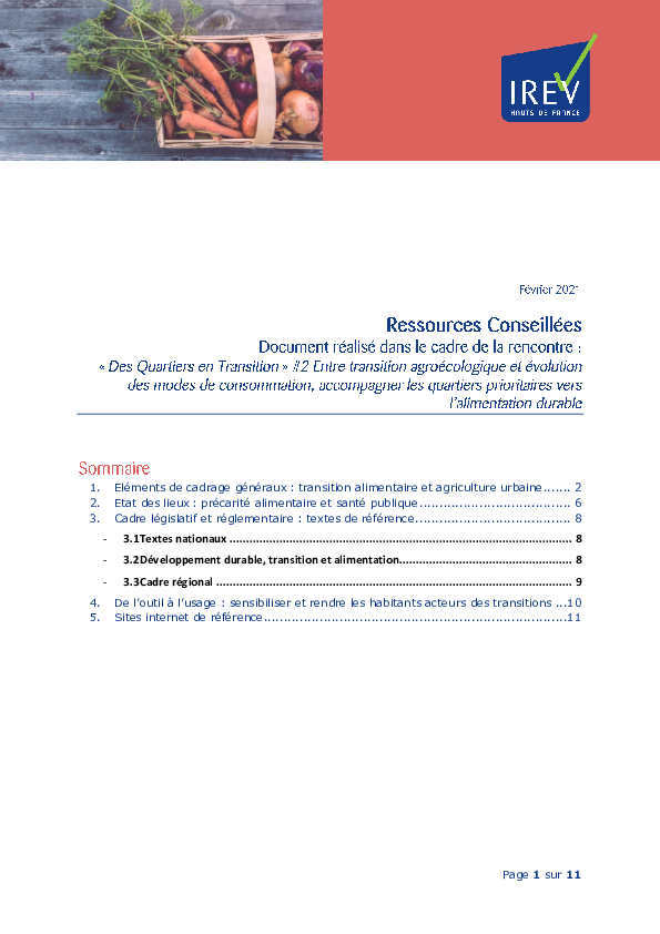 Ressources documentaires conseillées sur l'alimentation durable, compilées sous forme de bibliographie pour la rencontre "Entre transition agroécologique et évolution des modes de consommation, accompagner les quartiers prioritaires vers l'alimentation durable" du cycle Des quartiers en transition en février 2021.