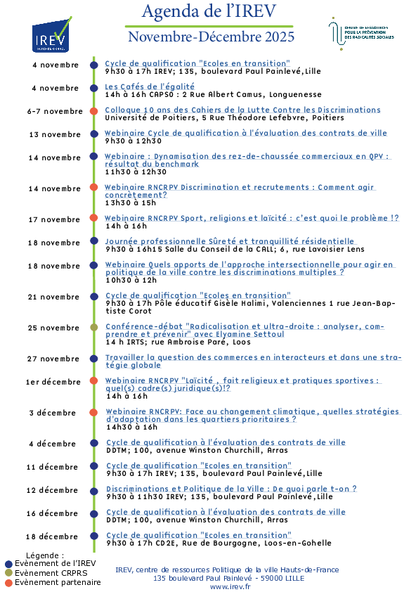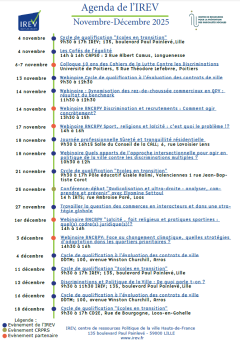 L'année s'achève mais reste tout autant riche en évenements proposés par l'IREV avec de nombreuses sessions de sensibilisation, formationn qualificationsur tout ce qui fait la politique de la ville dans ses différentes composantes (lutte contre les discriminations,évaluation des contrats de ville, développement économique, ..)