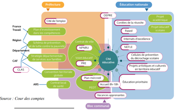 Le rapport met en avant l’utilité des cités éducatives comme vecteur d’expérimentation et de mise en cohérence des dispositifs existants. L’objectif est de conserver à partir de ces expérimentations des types d’actions et des modes de faire qui pourront ensuite se maintenir de manière durable dans le droit commun. L’ambition de mise en cohérence a aussi vocation à mieux mobiliser le droit commun et à générer une meilleure connaissance des dispositifs existants, pour éviter les doublons et le travail en silos. Le manque de mobilisations d’autres ministères en lien (culture, santé) est un frein pour mobiliser les instances comme la CAF, ARS et DRAC, ou encore la Djepva (Direction de la jeunesse, de l’éducation populaire et de la vie associative). Selon la Cour des Comptes, les conventions interministérielles pourraient être un levier pour impulser et faciliter l’articulation avec le droit commun et éviter les effets de doublons ou d’éviction.