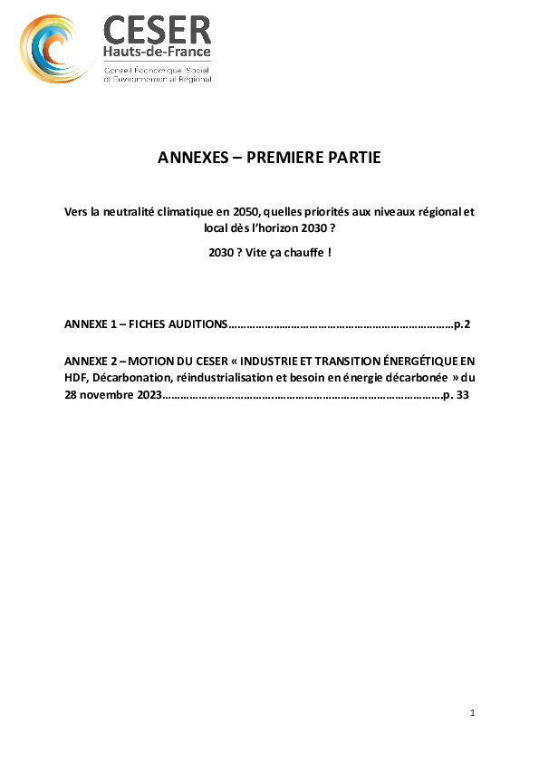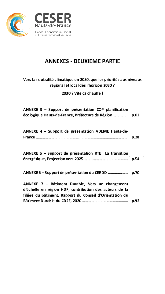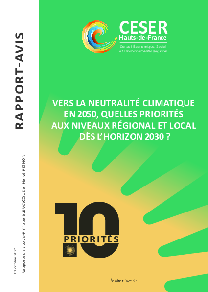 Le mardi 7 octobre 2025, le CESER Hauts-de-France a adopté ce rapport-avis porté par la Commission Transition Energétique et Rev3, présidée par Emmanuel COHARDY. Les deux rapporteurs, Louis-Philippe BLERVACQUE et Hervé PIGNON, ont synthétisé 10 grandes priorités à mettre en œuvre à l’Horizon 2030 pour atteindre la neutralité climatique qui ont été dévoilées lors du colloque « 2030 ? Vite, ça chauffe ! », colloque organisé par le CESER qui a réuni plus de 350 participants. avec pour invité d’honneur François GEMENNE, enseignant-chercheur et ancien Vice-président du GIEC.10 mesures prioritaires pour mettre en œuvre cette neutralité carbone