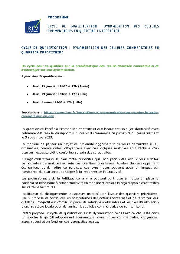 L’IREV propose un cycle de qualification sur la dynamisation de ces rez-de-chaussée dans un spectre large (développement économique, dynamiques commerciales, citoyennes, associatives) et en fonction des diagnostics locaux.