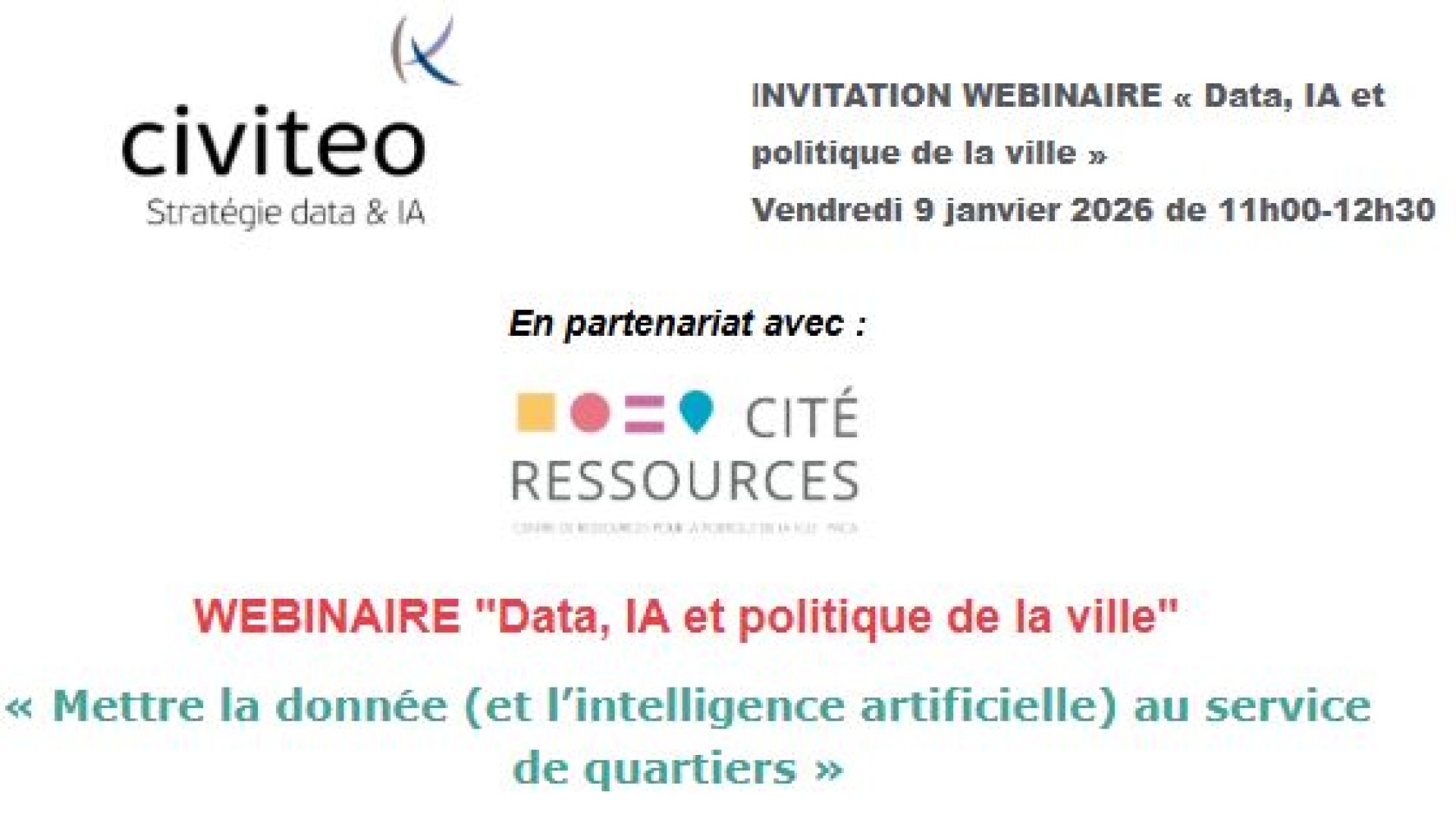 Ce webinaire est proposé en partenariat avec Cité Ressources. Il sera animé par Jacques Priol, Président du cabinet CIVITEO, expert de la gestion des données publiques, auteur de plusieurs ouvrages et articles sur la gestion des données et l’IA dans les politiques publiques.