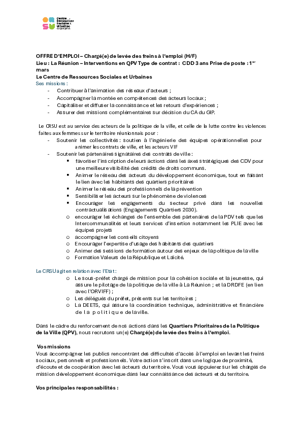 • Le centre de ressources sociales et urbaines de la Réunion recrute Chargé(e) de levée des freins à l’emploi (H/F)