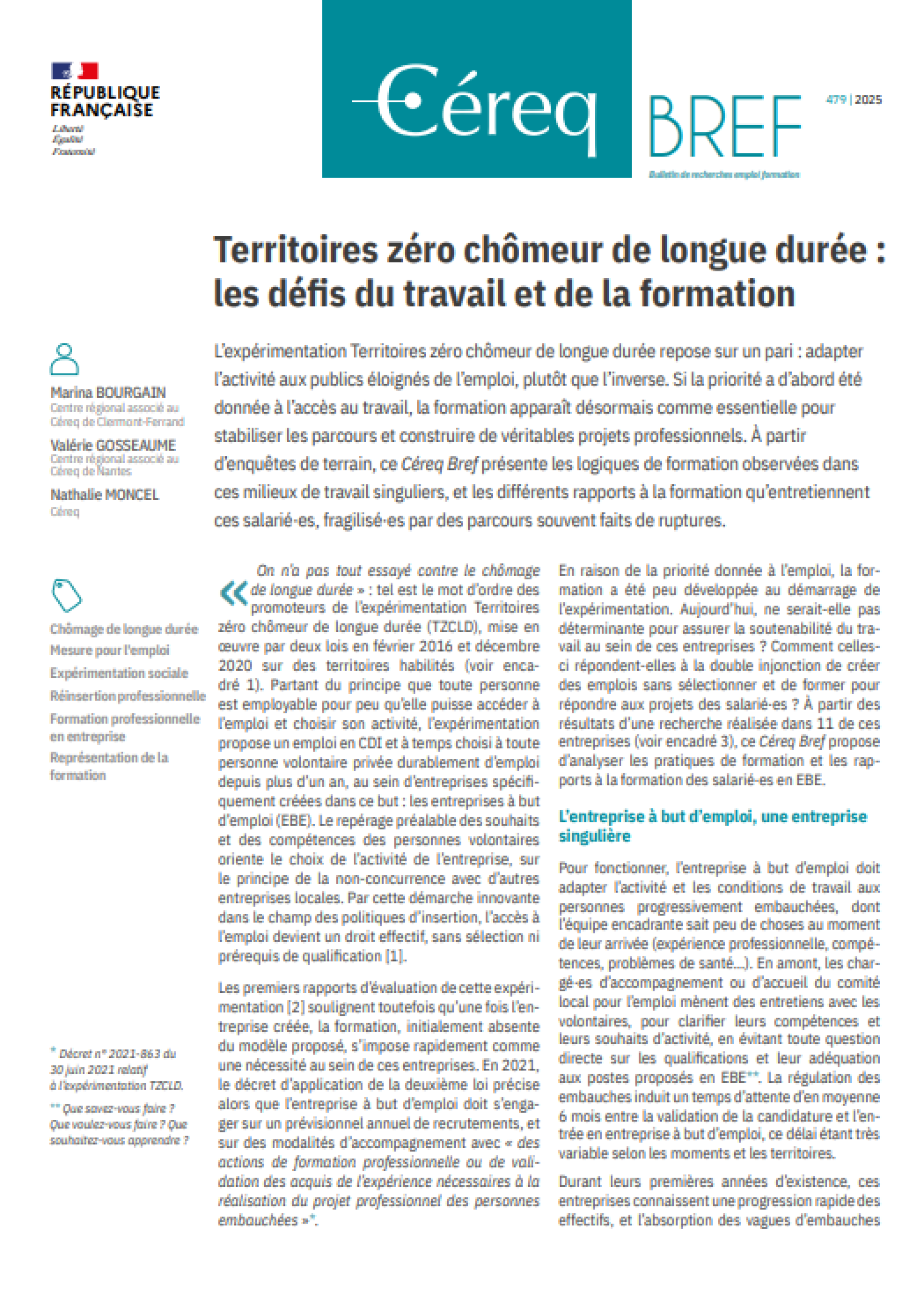 L'expérimentation Territoires Zéro Chômeur de Longue Durée (TZCLD) lancée en 2016 avec pour objectif de permettre et proposer à des personnes, en situation de chômage de longue durée, un travail en CDI adapté à leurs capacités et choisi par elles avec des structures créées à cet effet dénommées Entreprises à But d’Emploi (EBE).