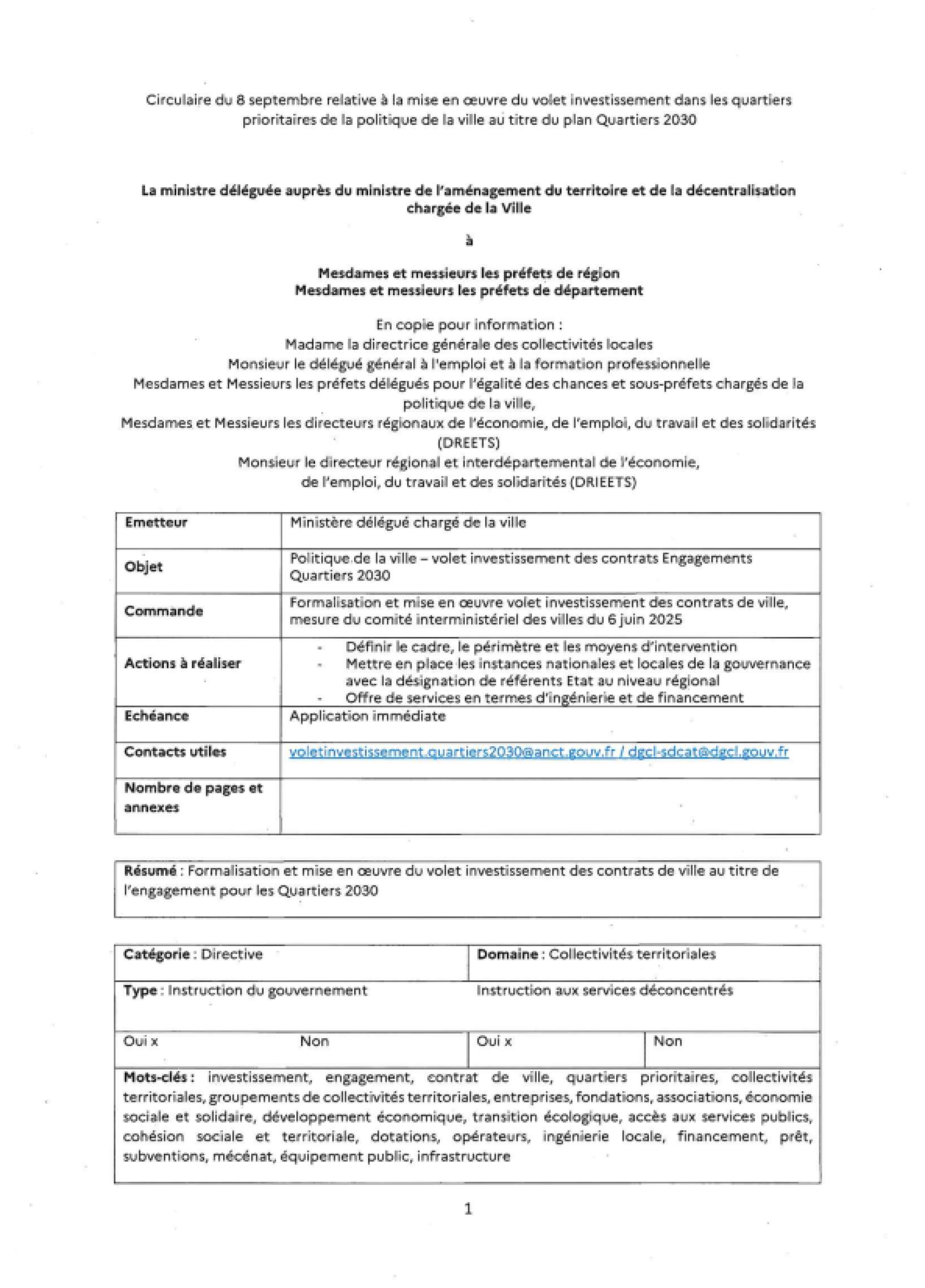 La circulaire du 8 septembre 2025 adressée aux Préfets permet de préciser les modalités de formalisation et de mise en oeuvre de ce volet investissement, ainsi que la mesure du Comité interministériel des Villes (juin 2025) visant à recruter, à titre expérimental, 30 chefs de projet dédiés, co-financés par la Banque des territoires.