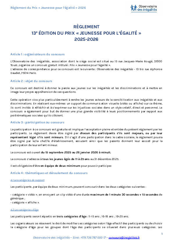 Ce concours a pour objectif de donner la parole aux jeunes sur le thème des inégalités et des discriminations en leur permettant de mettre leurs propres mots, images sur ces problématiques.
