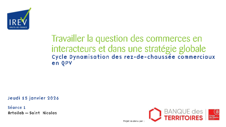 La présentation reprend les éléments projetés sur plusieurs séquences : les éléments clés de la Politique de la Ville en région Hauts-de-France, l'approche développement économique dans les QPV, la présentation du benchmark sur la dynamisation des rez-de-chaussée commerciaux et les éléments de conclusion de la première journée du cycle sur les rez-de-chaussée commerciaux.