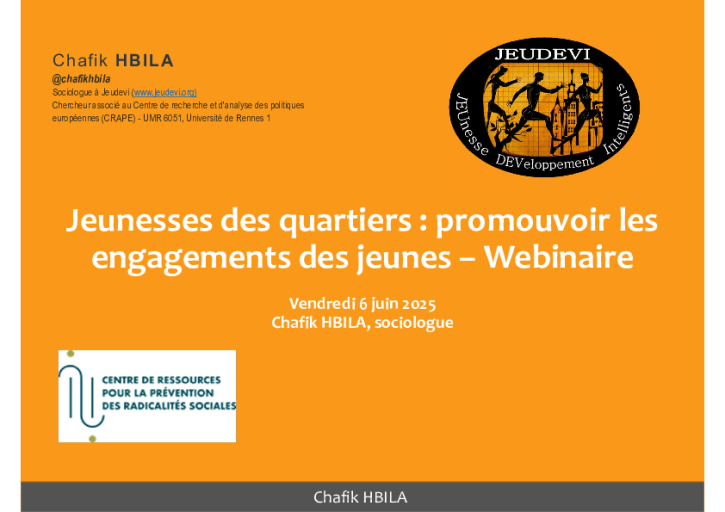 Chafik Hbila, sociologue et co-gérant de la société JEUDEVI, a tout d'abord posé le cadre de l'intervention du jour. Il a rappelé quelques définitions autour de l'engagement, de la participation et de l'autonomie des jeunes des quartiers populaires. Il a aussi indiqué les bénéfices qu'une société peut attendre d'une meilleure participation des jeunes : à travers l'expérimentation, le jeune s'émancipe et se prépare à ses responsabilités futures. Les jeunes qui se rendent compte de leur pouvoir d'agir sont donc ceux qui oeuvreront plus tard à la cohésion sociale. Chafik Hbila a également proposé différents profils d'engagement chez les jeunes : le "jeune entrepreneur de sa vie" qui s'engage pour pallier à des difficultés d'affiliation sociale ; le jeune qui participe à des projet de cohésion sociale en groupe visant à modifier le quotidien de son quartier ; le jeune qui transcende son intérêt particulier pour se concentrer sur l'intérêt général et qui va entrer dans une forme de "citoyenneté politique" ; et enfin le "jeune philantrope" qui s'engage dans des projets à dimension éthique ou humanitaire.