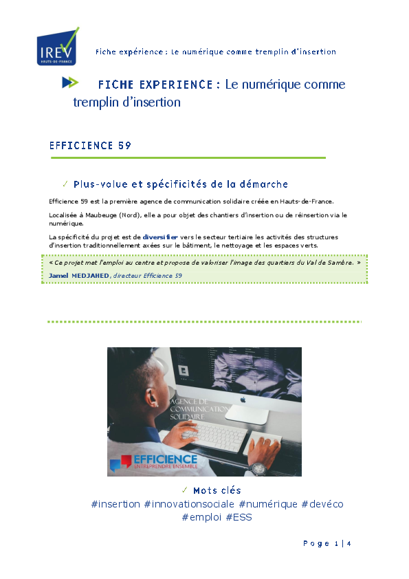 Efficience 59 est la première agence de communication solidaire créée en Hauts-de-France. Localisée à Maubeuge (Nord), elle a pour objet des chantiers d’insertion ou de réinsertion via le numérique. La spécificité du projet est de diversifier vers le secteur tertiaire les activités des structures d’insertion traditionnellement axées sur le bâtiment, le nettoyage et les espaces verts.