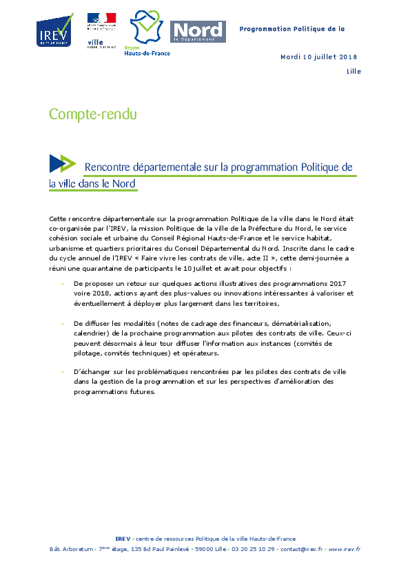 Synthèse de la rencontre sur la programmation des Contrats de Ville 2019 pour le département du Nord qui s'est déroulée le 10 juillet 2018 à Lille